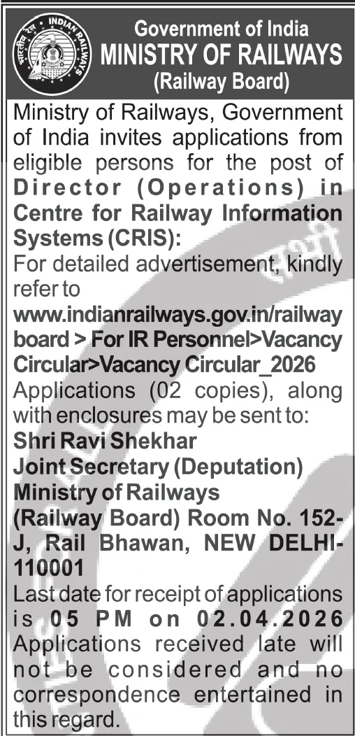 The Centre for Railway Information Systems (CRIS), under the Ministry of Railways, Government of India, has announced recruitment for the post of Director (Operations) in 2026. This recruitment drive aims to fill 1 senior-level vacancy through deputation from eligible officers working in Central Government departments, public sector organizations, or railway services. Candidates with relevant administrative or operational experience and appropriate educational qualifications are eligible to apply for this prestigious government position. The recruitment process will be based on evaluation of applications and official recommendations as per deputation rules. Interested candidates must submit their offline applications through the proper channel before the deadline of 02 April 2026.