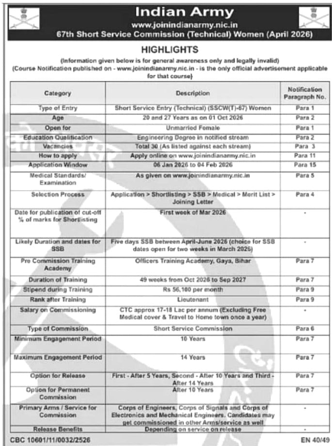 The Indian Army has released a notification for the recruitment of 30 Short Service Commission (SSC) Tech 67th Women posts for unmarried female engineering graduates. Eligible candidates with B.E./B.Tech degrees can apply online for this opportunity to serve in the Indian Army. The last date to apply is 4th February 2026, and the course will commence at Officers Training Academy (OTA), Chennai.