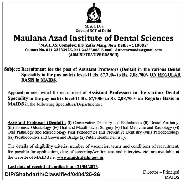 Maulana Azad Institute of Dental Sciences (MAIDS), Government of NCT of Delhi, has announced recruitment for Assistant Professor (Dental) posts in multiple dental specialties on a regular basis. This recruitment offers a strong opportunity for candidates with postgraduate dental qualifications (MDS) and relevant teaching or research experience as per Dental Council of India norms. The vacancies are distributed across various departments such as Oral Surgery, Periodontology, Prosthodontics, and more. Candidates seeking government teaching jobs in Delhi can apply before the last date of 21 April 2026.
