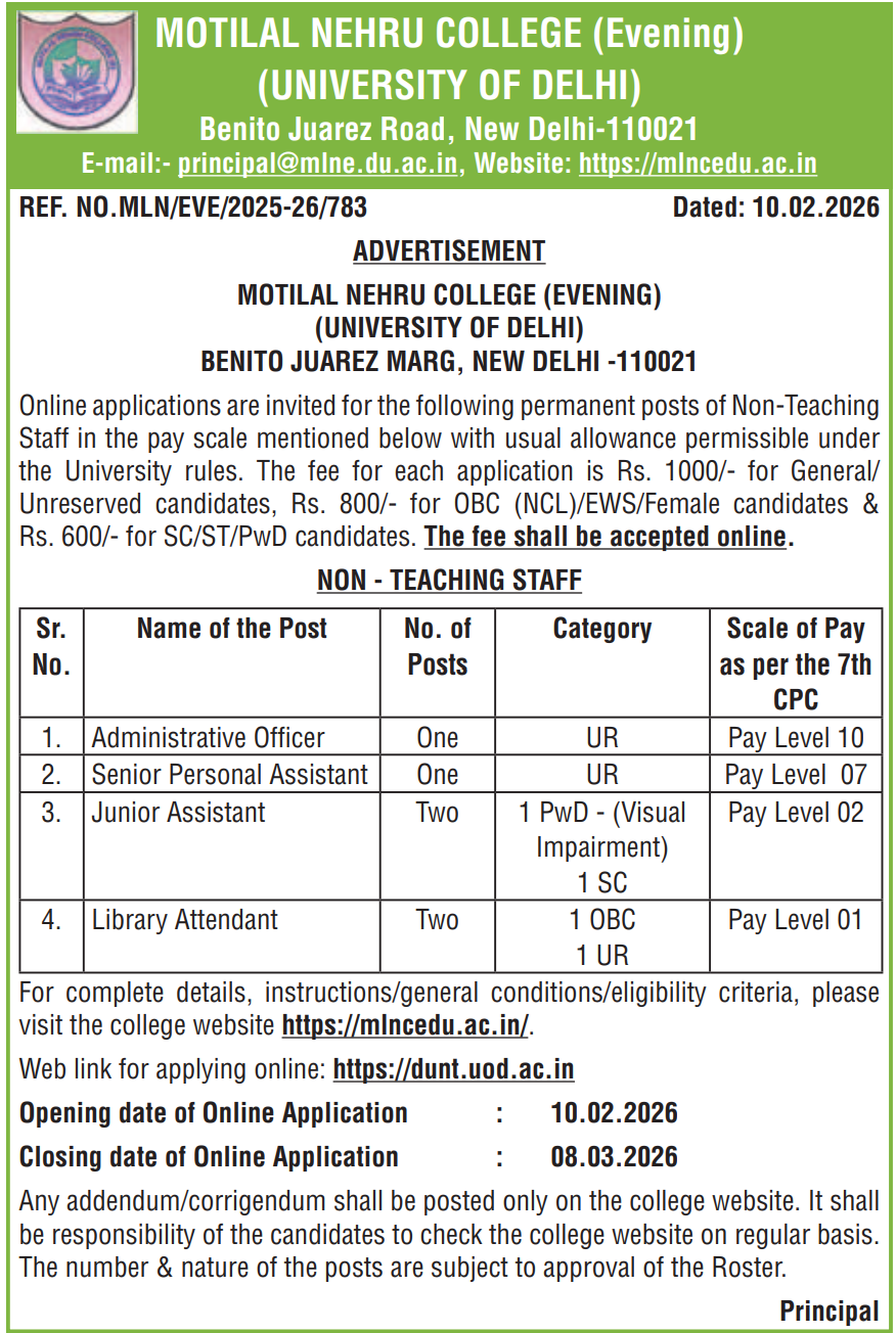 Motilal Nehru College (Evening), University of Delhi, has released a recruitment notification for 06 permanent non-teaching vacancies across multiple administrative and support staff roles. The advertised posts include Administrative Officer, Senior Personal Assistant, Junior Assistant, and Library Attendant positions, offering opportunities for graduates, postgraduates and diploma holders depending on the role. These posts fall under various pay levels of the 7th CPC, and the selection process includes written tests, skill tests or interviews as applicable. Eligible candidates must apply online through the official DU portal before the last date of 08 March 2026.