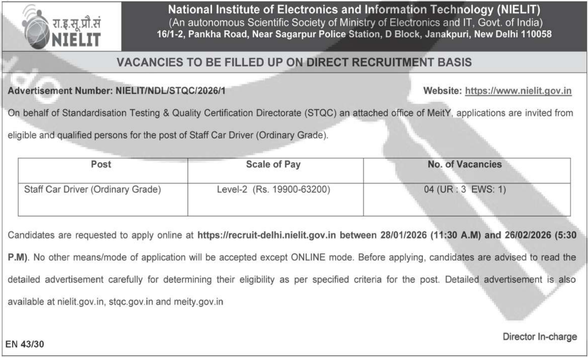 The National Institute of Electronics and Information Technology (NIELIT), on behalf of the Standardisation Testing & Quality Certification (STQC) Directorate under MeitY, Government of India, has invited online applications for the recruitment of Staff Car Driver (Ordinary Grade). A total of 04 vacancies are available under direct recruitment. Candidates must be 10th pass and possess a valid Light Motor Vehicle driving license with at least 3 years of driving experience. The recruitment process involves a driving skill test, a written test (if applicable), and document verification. The application window is open from 28 January 2026 and will close on 26 February 2026.