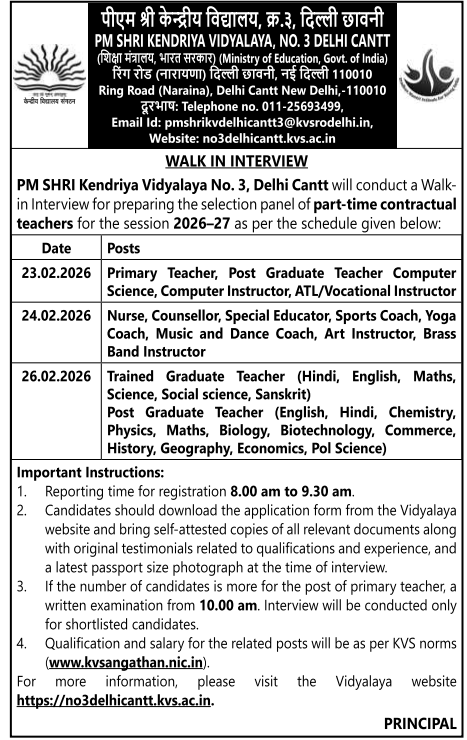 PM SHRI Kendriya Vidyalaya No. 3 Delhi Cantt, under the Ministry of Education, Government of India, has released a notification for preparing a panel of part-time contractual teachers and instructors for the academic session 2026–27. The recruitment will be conducted through walk-in interviews scheduled on 23rd, 24th, and 26th February 2026. Various teaching and non-teaching posts including PGT, TGT, Primary Teacher, Computer Instructor, Nurse, Counsellor, Special Educator, Coaches, and Instructors will be filled on a purely contractual basis. Eligible candidates must appear in person with required documents as per KVS norms.