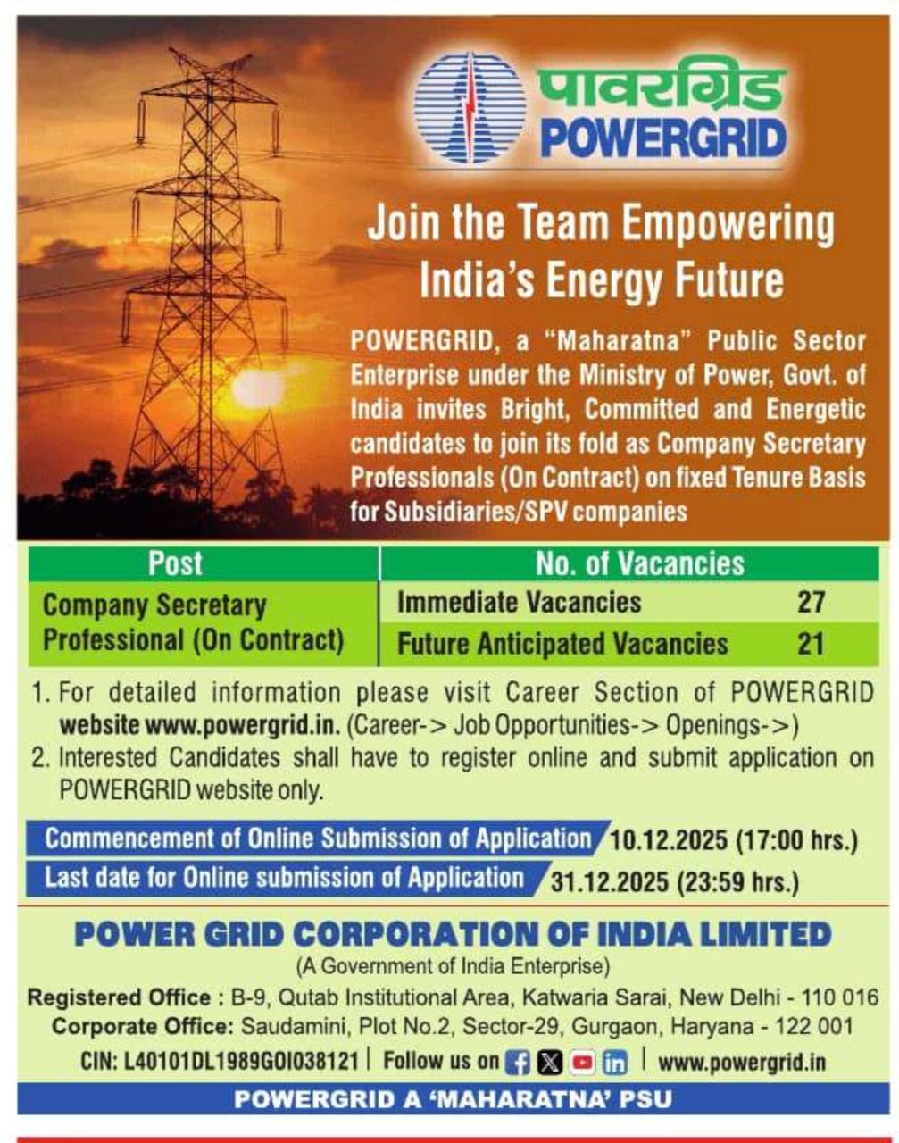 Power Grid Corporation of India Limited (POWERGRID), a Maharatna PSU under the Ministry of Power, has invited online applications for 48 Company Secretary Professional posts on a Fixed Tenure Basis. This includes 27 immediate and 21 anticipated vacancies across various subsidiaries and SPV companies of POWERGRID. The recruitment is open to Associate Members of ICSI with at least one year of post-qualification experience. Interested candidates can apply online from 10th December to 31st December 2025.